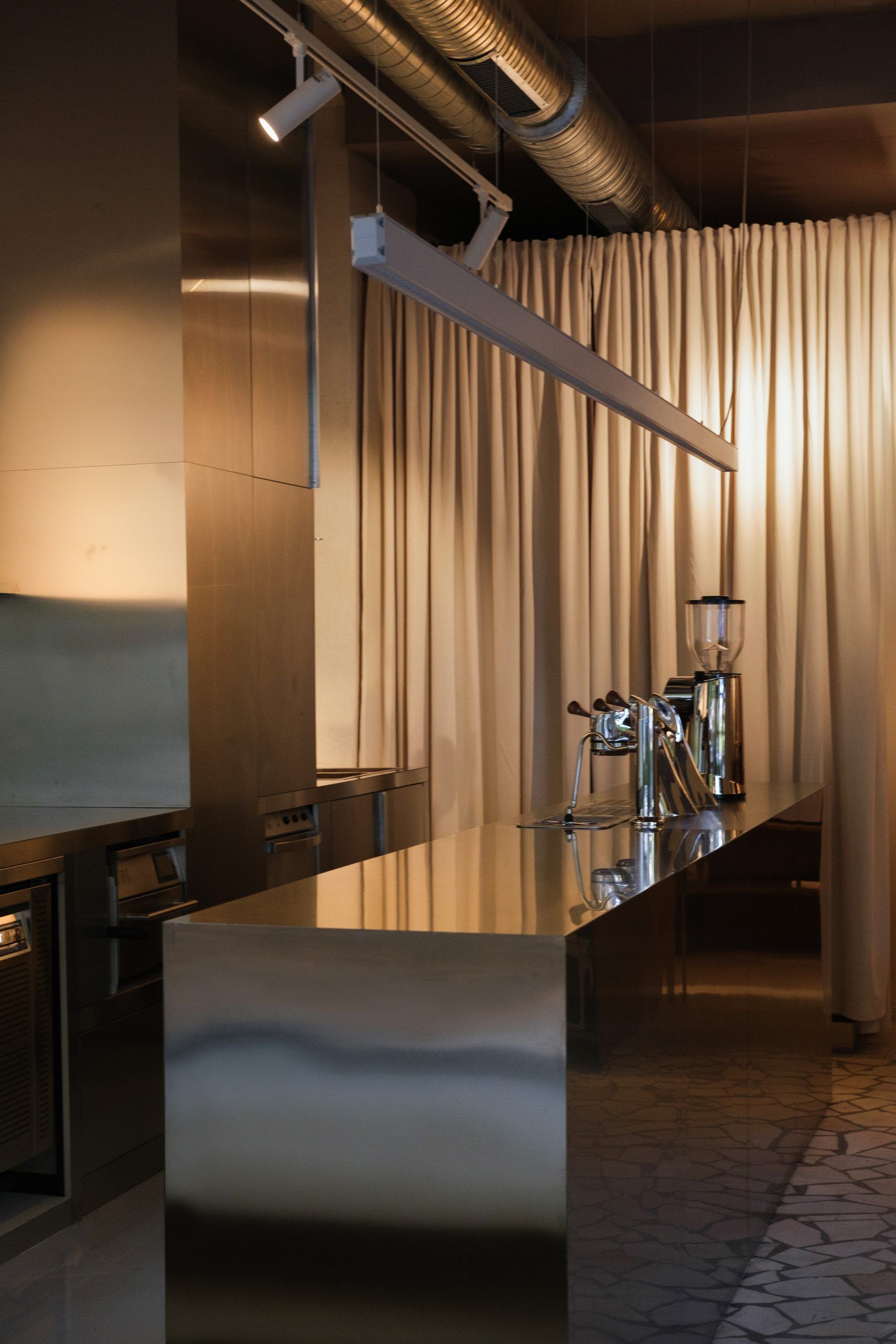 Kívülről az épület talán nem tűnik különlegesnek, de közelebbről nézve a román szocialista modernizmus korai, szépen megőrzött példája. Belül megtartottuk az eredeti velencei padlóburkolatot és a nyers beton oszlopokat – nemcsak láthatóan, hanem a dizájn középpontjába állítva. A többi anyaghasználat is olyan, mintha a hatvanas években választották volna: furnérozott rétegelt lemez, rozsdamentes acél. Ugyanakkor az oszlopokra és a központi világítótestre tett erőteljes gesztusok révén a tér egyértelműen kortárs, és a jövőbe mutat.