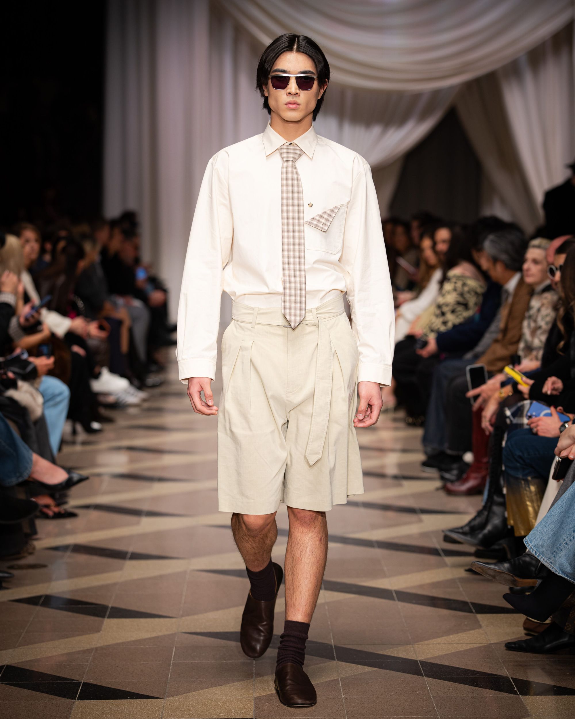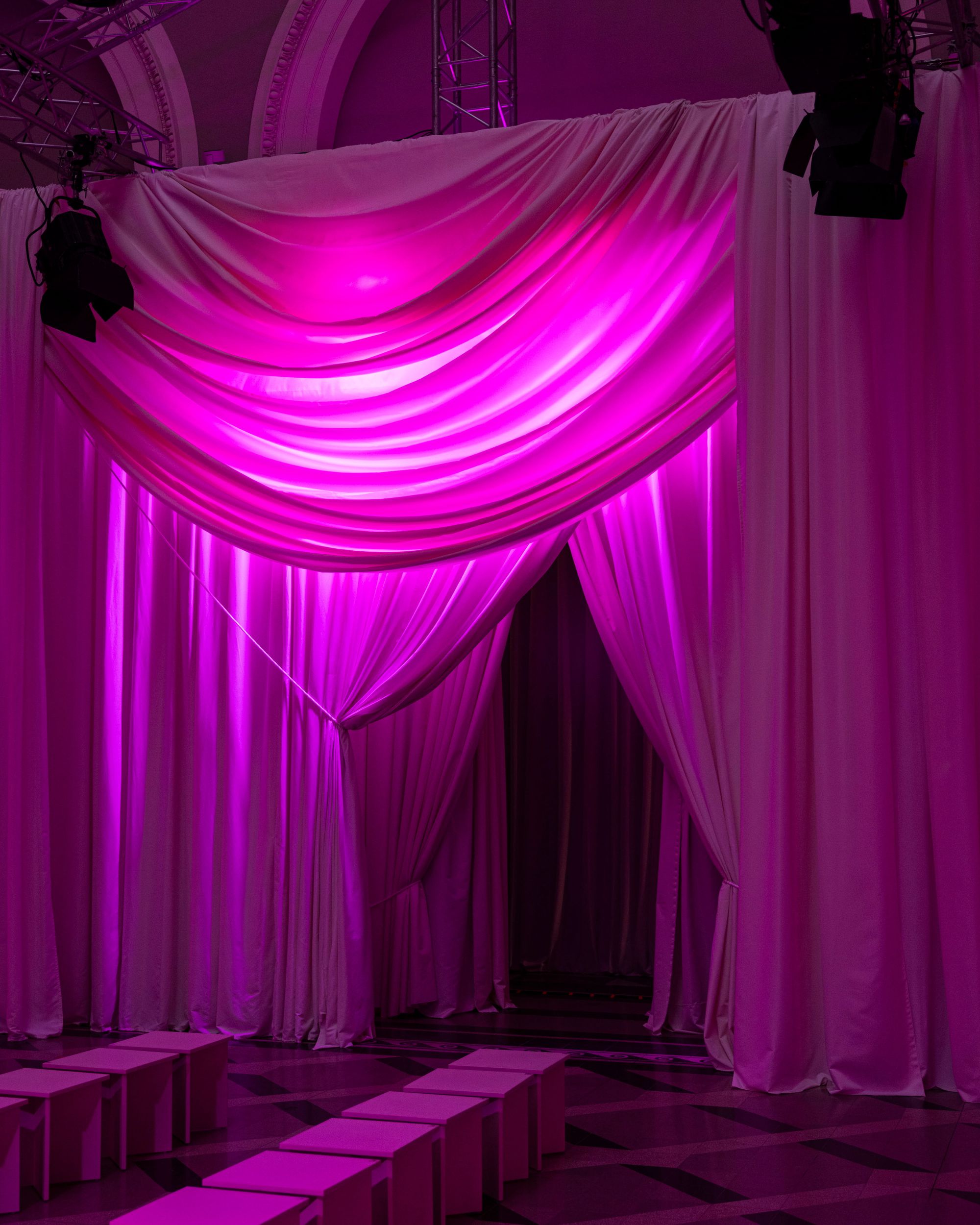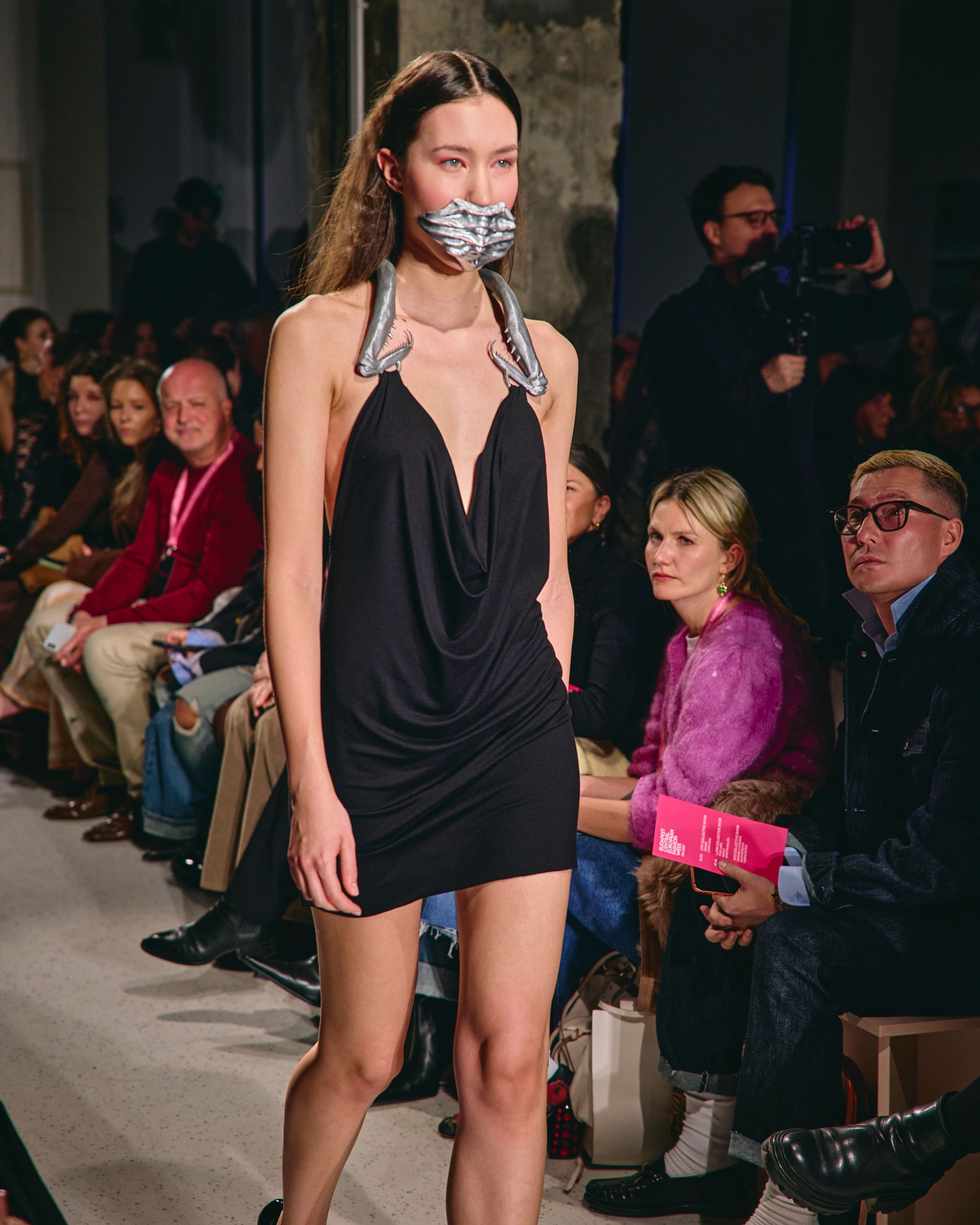 The opening Friday at Apollo Gallery was, almost traditionally, dedicated to the new generation. Models emerged between József Gaál’s monumental paintings, as if fashion and contemporary fine art existed not merely as backdrop and spectacle, but in genuine dialogue. The industrial character of the space suited collections that reflected on identity, body politics, or even post-apocalyptic futures. The regional collective shows — featuring Czech, Slovenian, Slovak, and Ukrainian designers — made it clear that Central European fashion is not a homogeneous bloc, but a terrain of diverse, often conflicting narratives. From menswear collections built from deadstock materials to techno-infused visions accompanied by 3D-printed jewelry, a broad spectrum unfolded. On Saturday and Sunday, the focus shifted to the grand halls of the Museum of Fine Arts, where more established, market-proven brands took center stage. The museum setting inevitably raises the stakes: here, collections must hold their ground both conceptually and in execution. Nanushka’s clean, responsible material use, the experimental regional brands working with recycled or hand-manipulated textiles, and the robust, texture-driven series together painted a picture in which sustainability is no longer a separate statement, but a given.