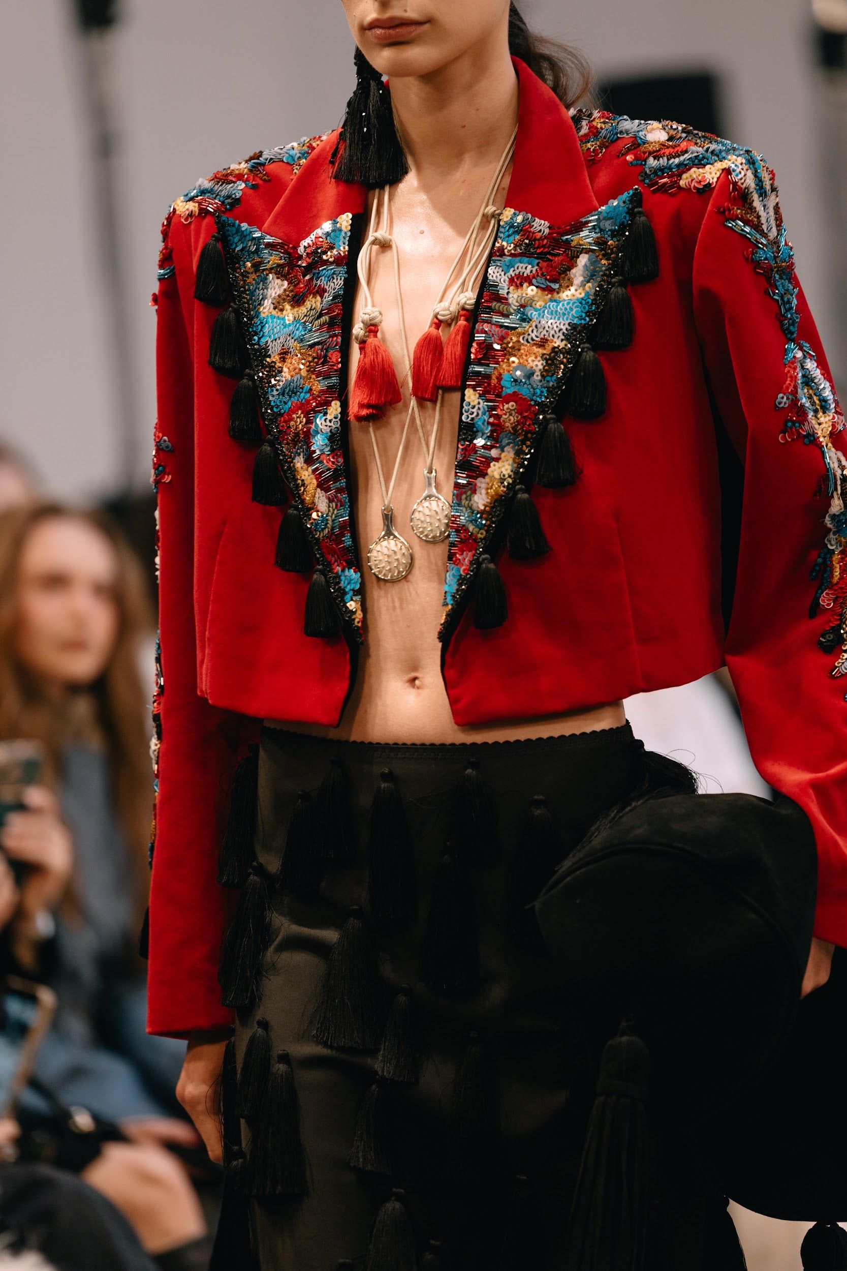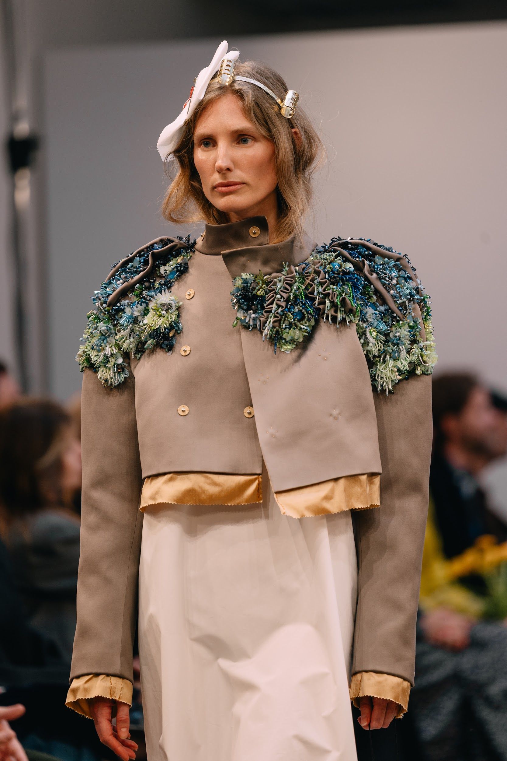 The evening opened with a live orchestral performance featuring excerpts from Modellé by Hans Zender. Ukrainian actress Larisa Rusnak from the Ivan Franko National Academic Drama Theatre appeared in a short theatrical scene, intentionally blurring the line between performer and spectator. Following this introduction, the audience experienced a retrospective showcase of MY THEATRE brand’s earlier collections, highlighting the creative evolution of the brand. This retrospective perspective was particularly significant for the designer: “This show was very special to me. I wanted to present the brand as a whole and reveal its evolution. Looking back at our earliest pieces, I can clearly see how much more attention we now devote to detail — to handcraft, to intricate embellishment, to the depth of each garment. Our direction is not about producing more, but about going deeper — refining the language and intensifying the emotional and artisanal dimension of the work.” One of the evening’s highlights was a musical performance by Onuka, whose atmospheric soundscape enhanced the immersive nature of the show. Craftsmanship remained at the core of the brand’s philosophy. Each piece featured meticulous details such as hand-crafted buttons, intricate embroidery, and luxurious fabrics including silk, velvet, brocade, and wool—many requiring dozens of hours of artisanal work.