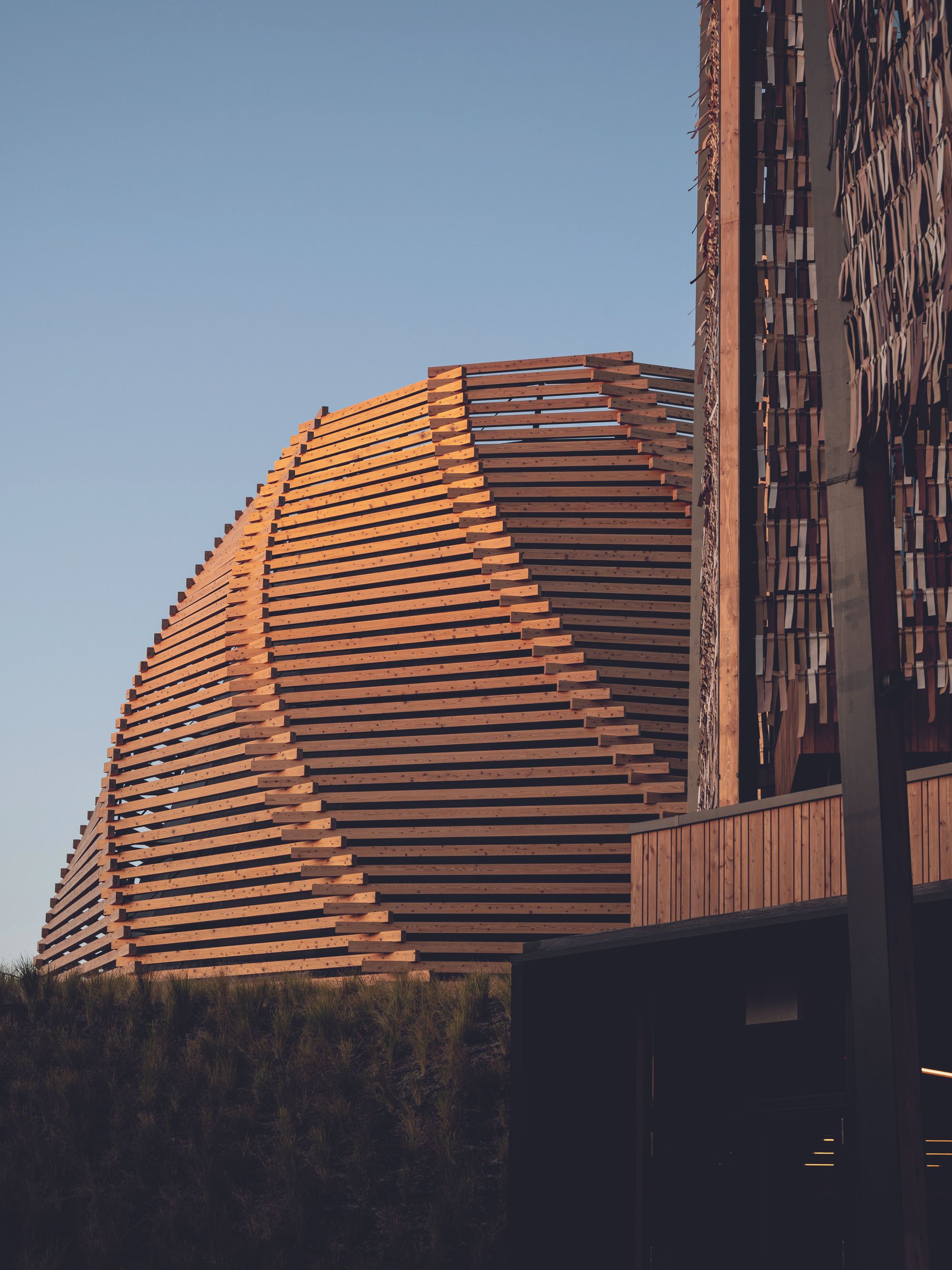 The Zengő Dome itself was clad in timber — a freestanding, gently twisting shell that surrounded the structure without touching it. The design drew inspiration from traditional Japanese architecture and the timberwork used in the Grand Ring, fusing local influences into the Hungarian concept. Beneath the wooden shell, the dome was enveloped in two membrane layers. The outer layer ensured acoustic and light insulation, allowing the space inside to become fully immersive. The inner membrane served a more symbolic role: designed to evoke a night sky filled with countless stars, it created a sense of cosmic vastness, drawing visitors into a space that felt infinite — yet deeply personal.