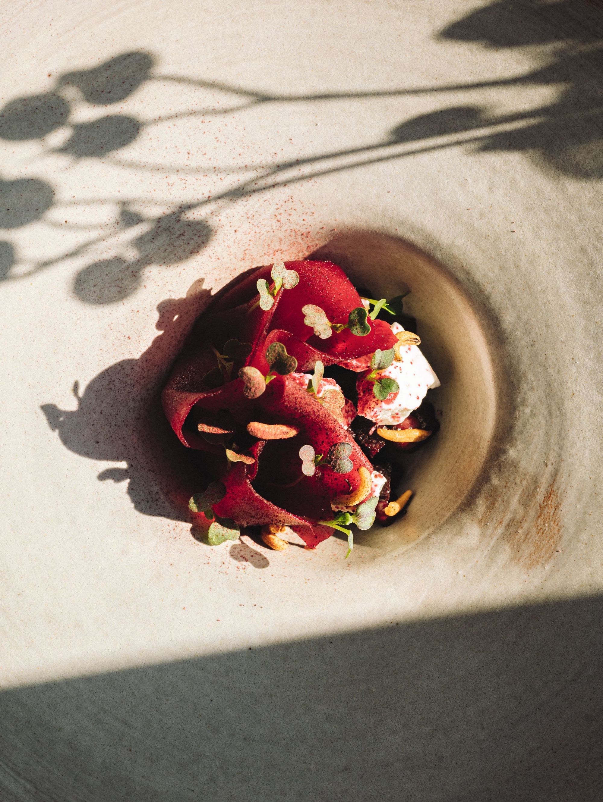 Morzsoljuk rá a kecskesajtot, a tetejére pedig kerülhetnek a marinált cékla szeletek. A legvégén pedig a cékla port szitáljuk rá.