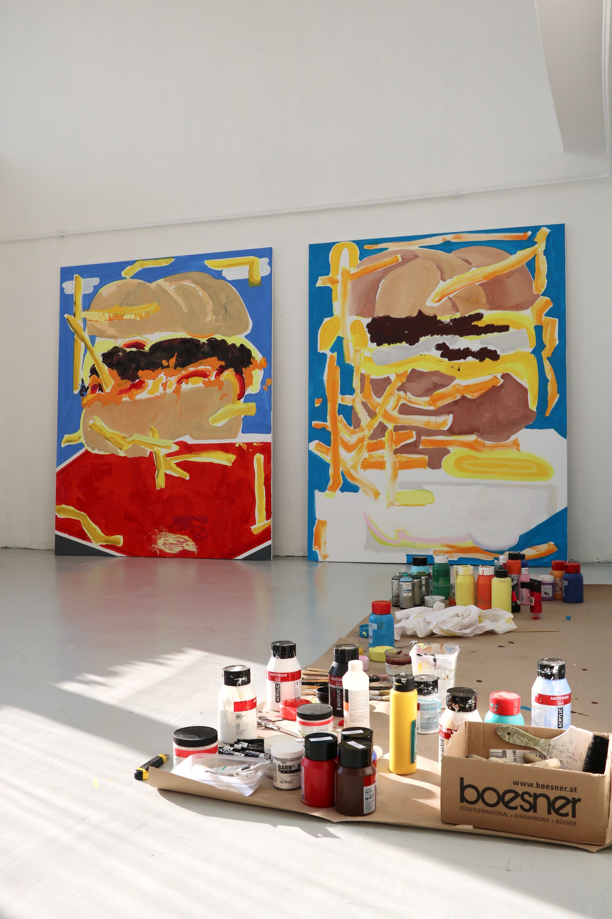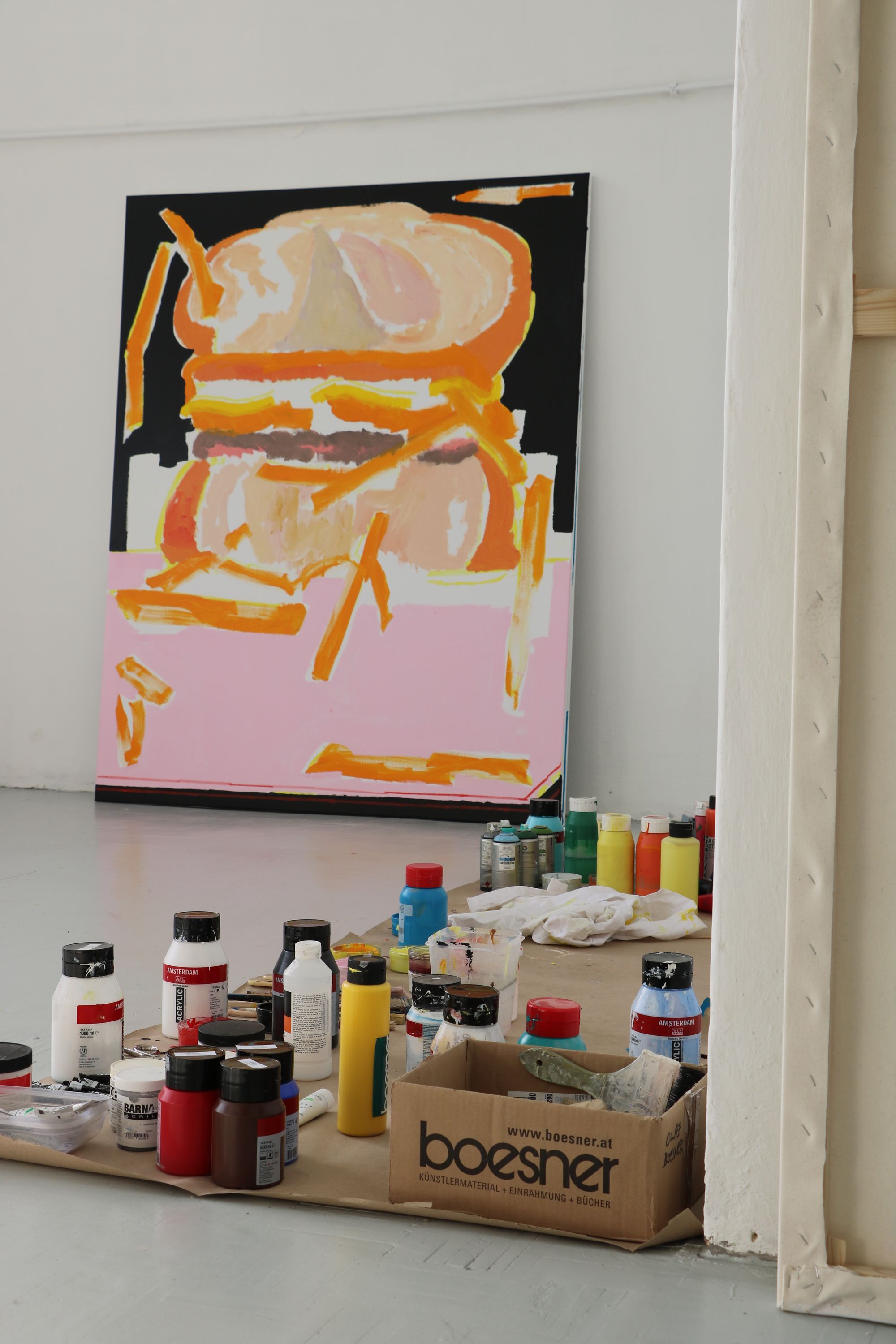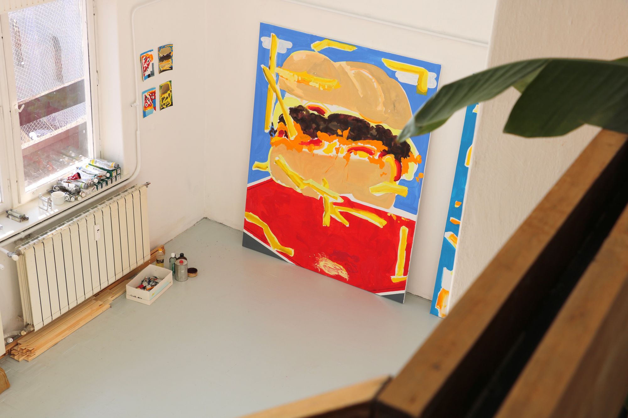 Nekem ez nagyon tetszett, hiszen az a kiállítás – Fast Lane to Happiness – tényleg csendéleteket mutatott be, és egyébként is mindig foglalkoztatott ez a dolog. Vonz a tárgyak ábrázolása, halmozása a vásznon, illetve hogy milyen hatást vált ki egy hagyományos képi médium által megjelenített kortárs fogyasztói motívum – felnagyítva, kontextusából kiragadva, laza, néhol túlzó, de ugyanakkor érzéki gesztusokkal megfestve. A hamburgerek, pizzaszeletek, sült krumplik, sneakerek, vagy szószos tégelyek.